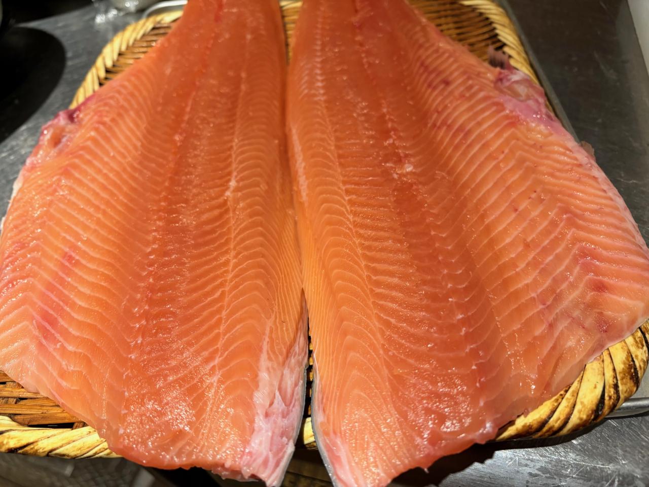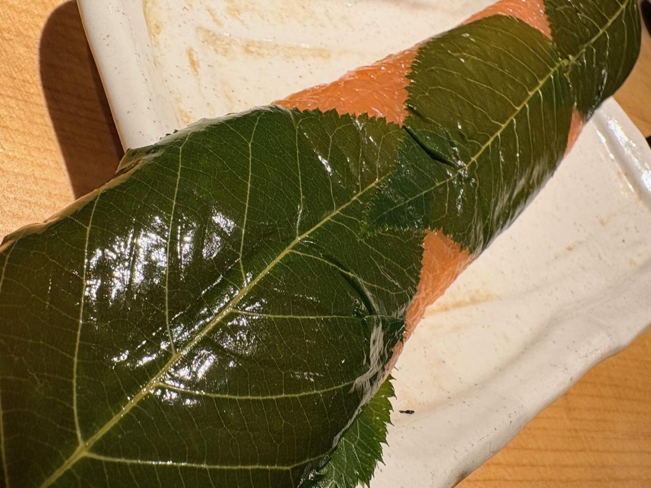 卸したら、桜の葉で香り漬ける事で、桜鱒の完成です!!